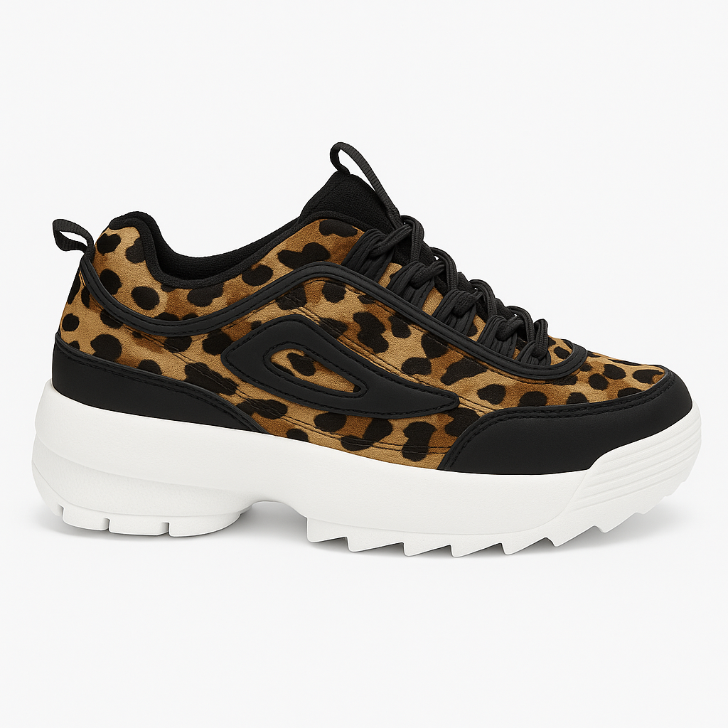 Varebeskrivelse: Chunky damesneaker med et moderne leopardmønster i brune og sorte nuancer kombineret med sorte detaljer og en kraftig hvid sål. Skoen har en sporty og trendy silhuet, der giver maksimal komfort og et markant look. Perfekt til hverdagsbr