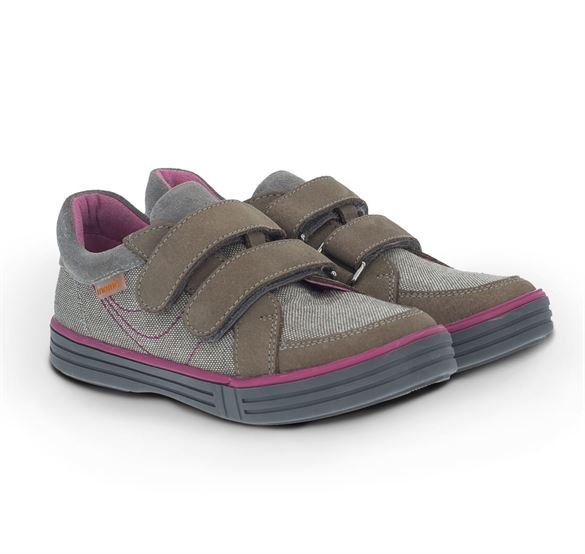 Lave Memo sneakers sko med velcro. Skoene er i gråbrun med pink detaljer. Modellen her er lavere og med lidt mindre fasthed end de fleste andre modeller fra Memo. Der er dog stadig en fast hælkappe med støtte om på siden. Skoene egner sig særligt godt,