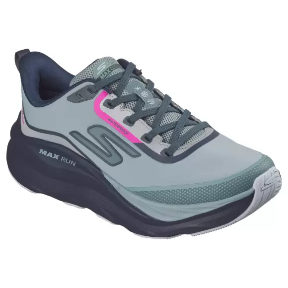 Art. No. 129203 SLTSkechers Women MAX RUN 129203 SLT er smarte og funktionelle sko til damer fra Skechers. De er designet i et sporty look med en kombination af blå og grå nuancer, som fremhæves af pink detaljer for et friskt udtryk. Skoene er vandtætte,